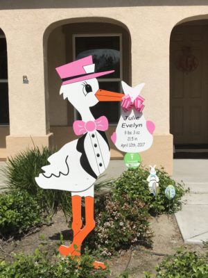 Please contact us at 714-262-0210 to rent a stork sign for your new baby or grandchild or a birthday cupcake or flamingo lawn sign for your favorite birthday boy or girl.